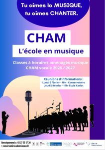 Classes à horaires aménagées Classe à Horaires Aménagés Musique – Ecole Cariot et Collège Carpeaux Les classes à horaires aménagés offrent aux jeunes élèves une formation personnalisée et équilibrée en vue de concilier les études générales et la pratique artistique. Ecole Primaire du Cariot – CE1, CE2, CM1, CM2 Collège Carpeaux – 6ème , 5ème , 4ème 3ème Ouverture CHAM vocale en 2026 Inscriptions Retrait des dossiers à partir du 15 janvier 2026 et dépôt jusqu’au 19 mars 2026.Tests d’entrée : vendredi 3 avril 2026 Réunions d’informations : CHAM école du Cariot Lundi 2 février 2026 – 18h – Conservatoire de Valenciennes Jeudi 5 février 2026 – 17h – Ecole du Cariot de Valenciennes Test d’entrée : vendredi 3 avril 2026 – Ecole du Cariot CHAM Collège Carpeaux Lundi 2 février 2026 – 18h – Conservatoire de Valenciennes – salle Debussy Vendredi 6 mars 2026 – 18h – Collège Carpeaux – salle 305 Tests d’entrée : mardi 31 mars et mercredi 1er avril 2026 – Conservatoire de Valenciennes Pour tous renseignements concernant les inscriptions, vous pouvez nous contacter par mail à conservatoire@ville-valenciennes.fr ou par téléphone au 03 27 22 57 30 N’hésitez pas à consulter notre Foire aux questions et les tarifs Dossier d’inscription CHAM VOCALE (A remplir en 3 exemplaires) Télécharger Dossier d’inscription CHAM INSTRUMENTALE (A remplir en 3 exemplaires) Télécharger Dossier d’inscription Cariot 2026-2027 Télécharger CHAM cariot l’ecole en musique Télécharger FLyer CHAM 2026 Télécharger
